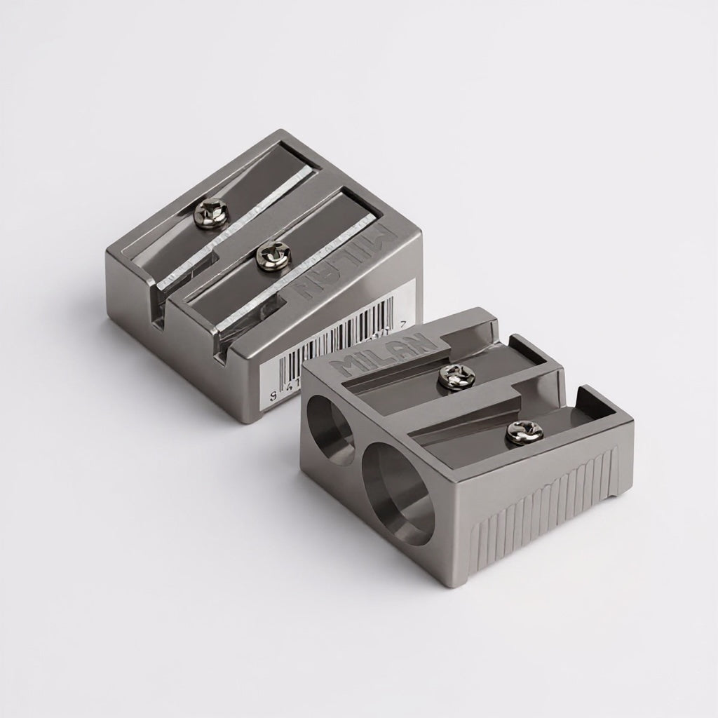 Sacapuntas versátil de aluminio con doble funcionalidad: agujero estándar para lápices convencionales y orificio MAXI para diámetros mayores. Equipado con cuchilla de acero al carbono de filo duradero y precisión superior, garantiza cortes limpios y uniformes en cualquier tipo de lápiz.