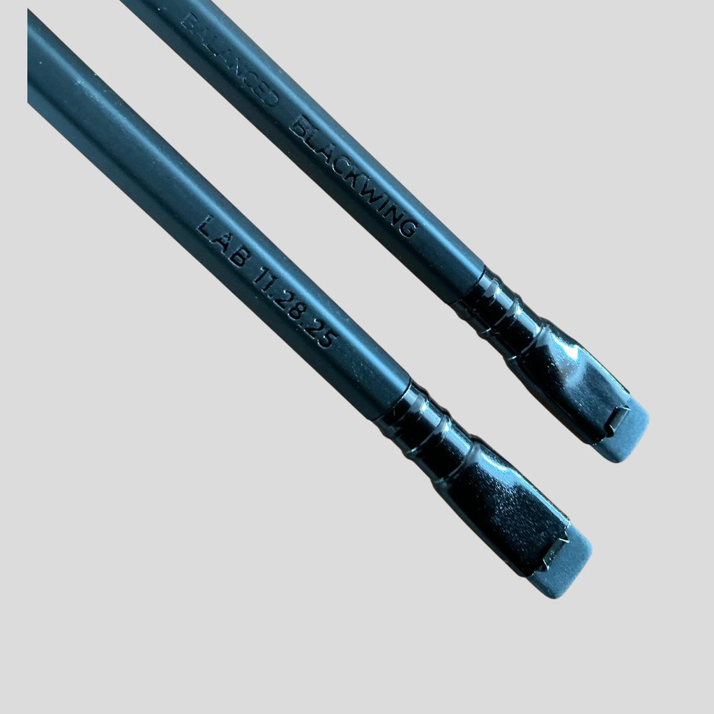 Con este Laboratorio, finalmente han creado el primer lápiz Blackwing completamente negro. Madera de cedro incienso genuino teñida de negro, laca negra mate, impresión negra, virola negra, clip negro, borrador negro y su grafito grafito equilibrado (3B)