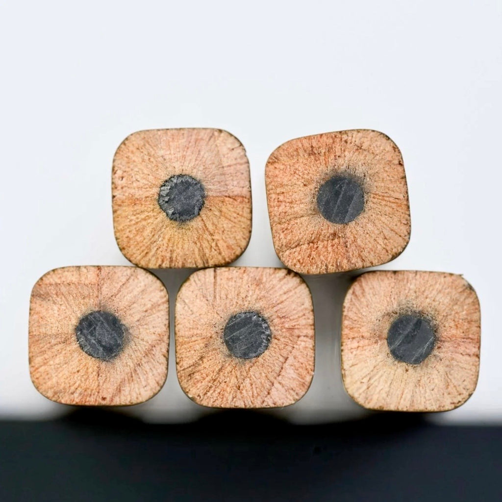 Cada lápiz está fabricado con listones especiales con juntas dentadas, creados mediante la combinación de dos listones cortos. Creando su cuerpo cuadrado con una cara extra ancha para que se puedan ver las juntas dentadas en cada lápiz.